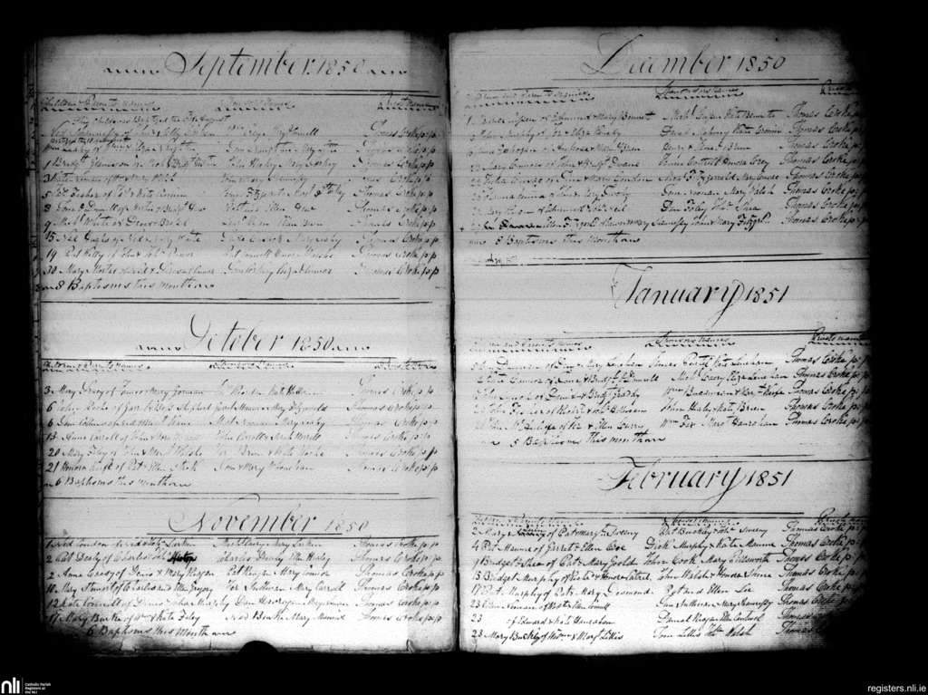 Charleville; County of Cork, Limerick; Diocese of Cloyne. Baptisms, Sep. 1850 to Feb. 1851