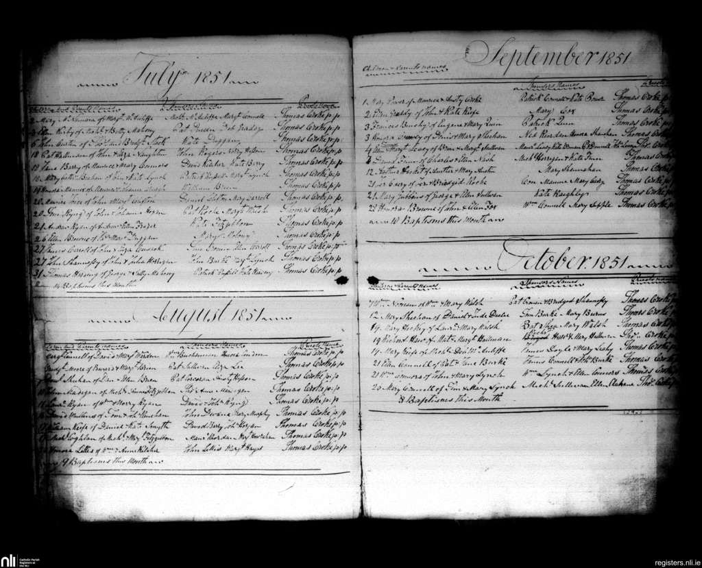 Charleville; County of Cork, Limerick; Diocese of Cloyne. Baptisms, July 1851 to Oct. 1851