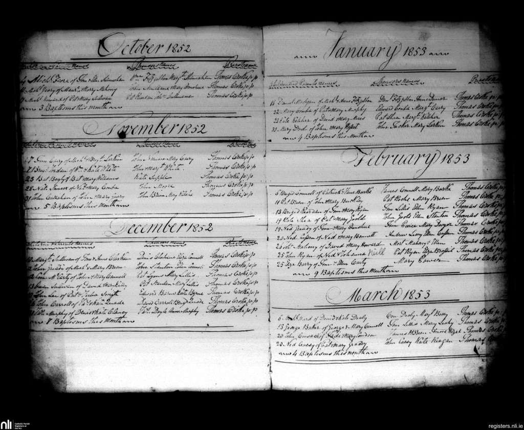 Charleville; County of Cork, Limerick; Diocese of Cloyne. Baptisms, Oct. 1852 to Mar. 1853