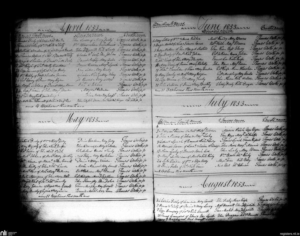 Charleville; County of Cork, Limerick; Diocese of Cloyne. Baptisms, Apr. 1853 to Aug. 1853