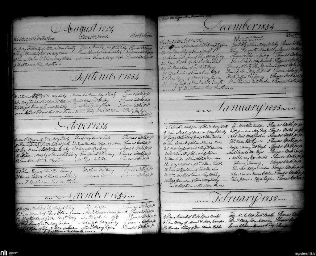 Charleville; County of Cork, Limerick; Diocese of Cloyne. Baptisms, Aug. 1854 to Feb. 1855