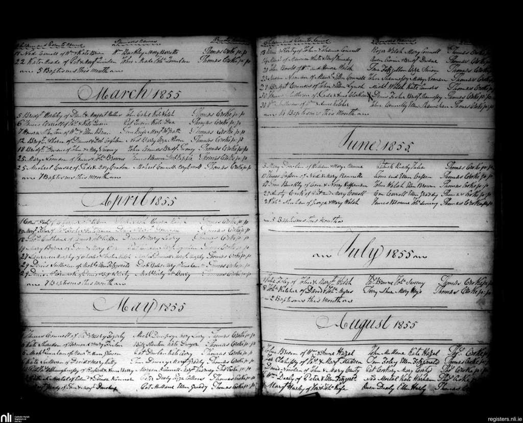 Charleville; County of Cork, Limerick; Diocese of Cloyne. Baptisms, Feb. 1855 to Aug. 1855