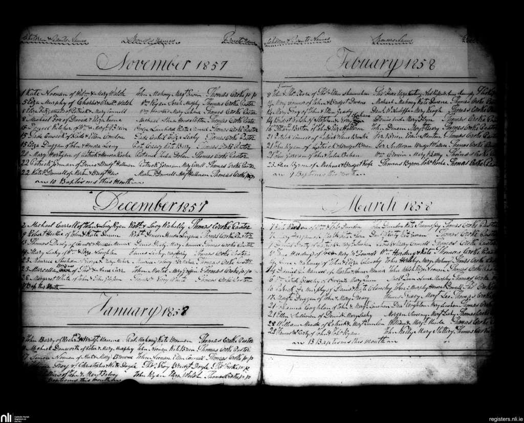 Charleville; County of Cork, Limerick; Diocese of Cloyne. Baptisms, Nov. 1857 to Mar. 1858