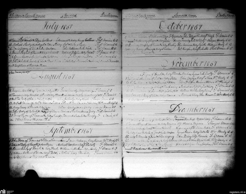 Charleville; County of Cork, Limerick; Diocese of Cloyne. Baptisms, July 1867 to Dec. 1867