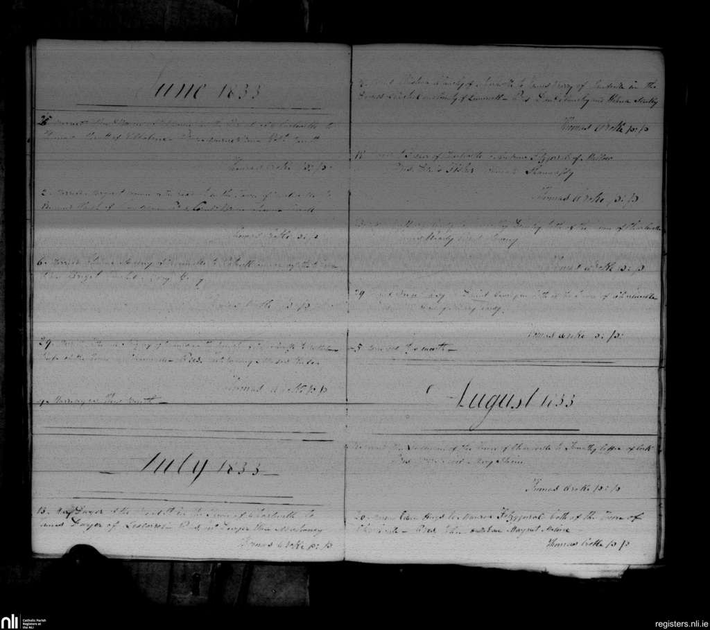 Charleville; County of Cork, Limerick; Diocese of Cloyne. Marriages, June 1833 to Aug. 1833