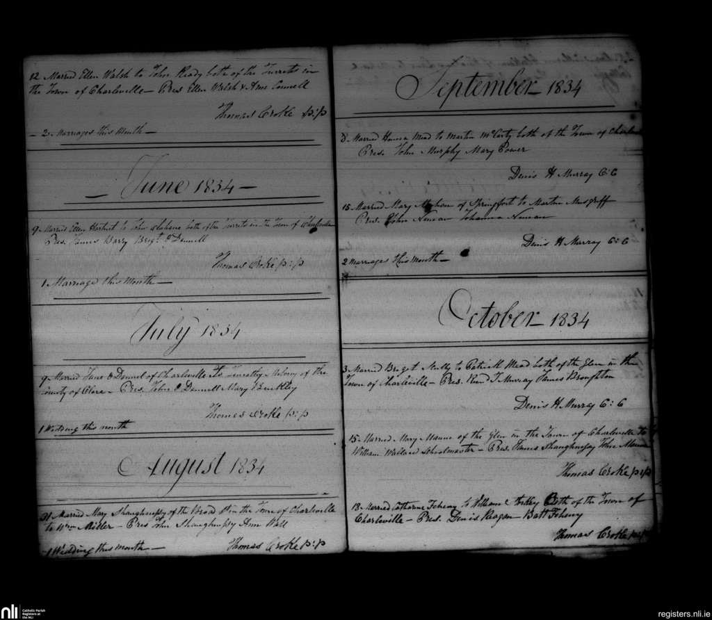 Charleville; County of Cork, Limerick; Diocese of Cloyne. Marriages, May 1834 to Oct. 1834