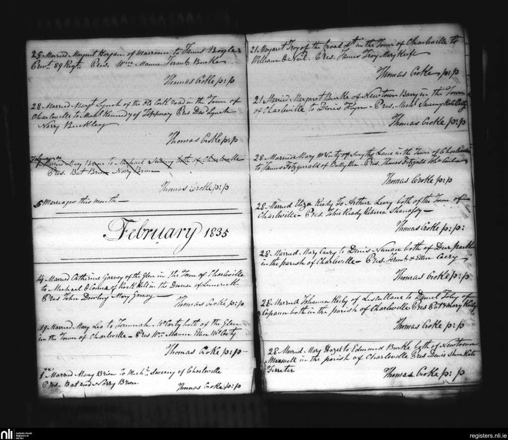 Charleville; County of Cork, Limerick; Diocese of Cloyne. Marriages, Jan. 1835 to Feb. 1835
