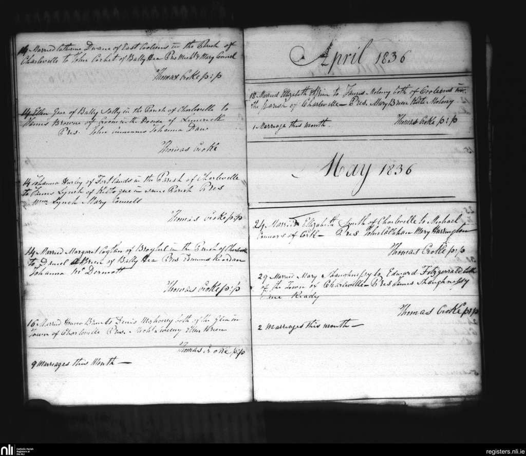 Charleville; County of Cork, Limerick; Diocese of Cloyne. Marriages, Feb. 1836 to May 1836