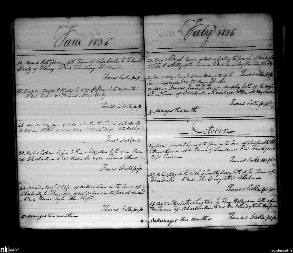 Charleville; County of Cork, Limerick; Diocese of Cloyne. Marriages, June 1836 to Oct. 1836