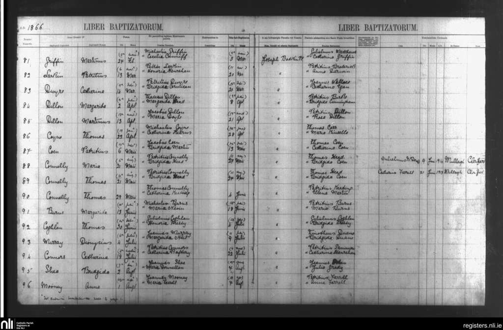 Mullagh; County of Galway; Diocese of Clonfert. Baptisms, Mar. 1866 to Aug. 1866