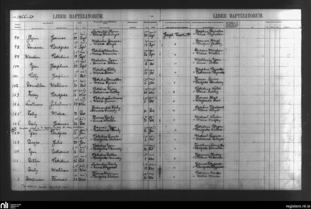 Mullagh; County of Galway; Diocese of Clonfert. Baptisms, Aug. 1866 to Mar. 1867