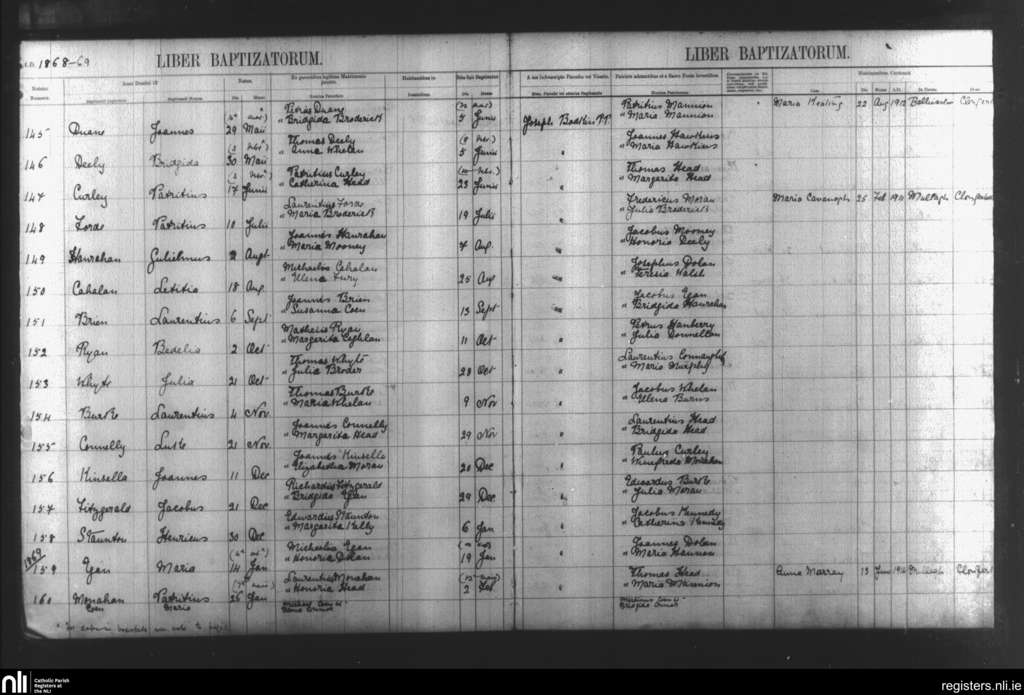 Mullagh; County of Galway; Diocese of Clonfert. Baptisms, June 1868 to Feb. 1869