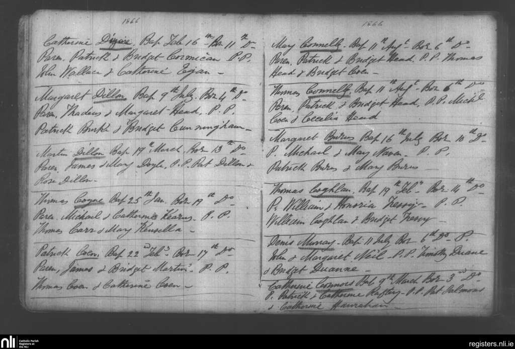 Mullagh; County of Galway; Diocese of Clonfert. Baptisms, Jan. 1866 to Aug. 1866
