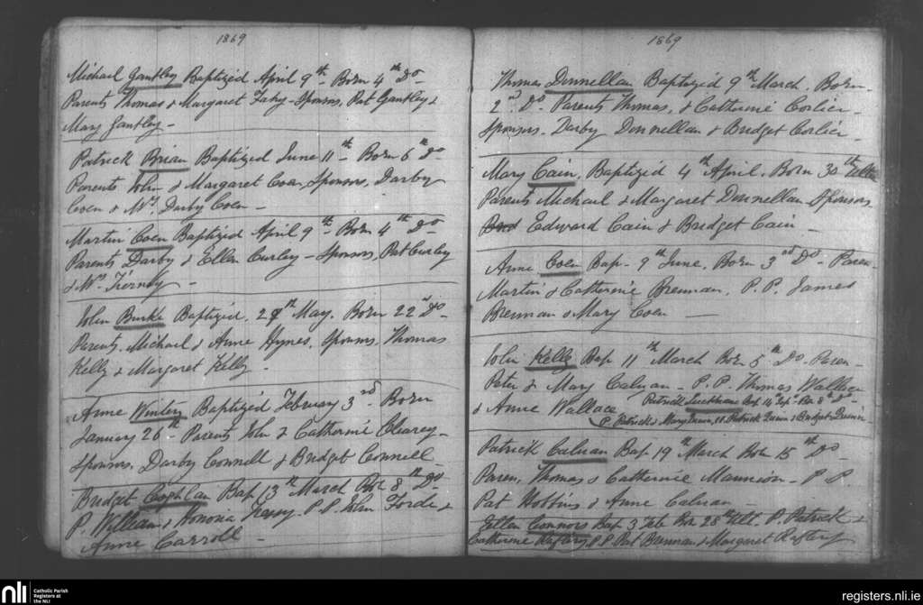 Mullagh; County of Galway; Diocese of Clonfert. Baptisms, Feb. 1869 to June 1869