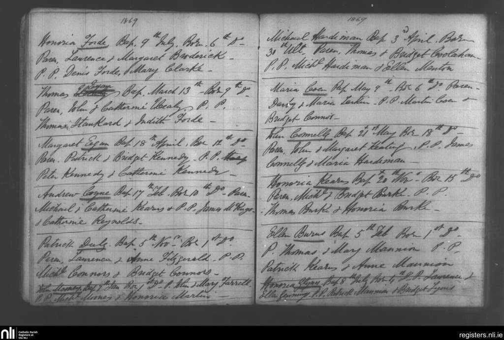 Mullagh; County of Galway; Diocese of Clonfert. Baptisms, Jan. 1869 to Nov. 1869