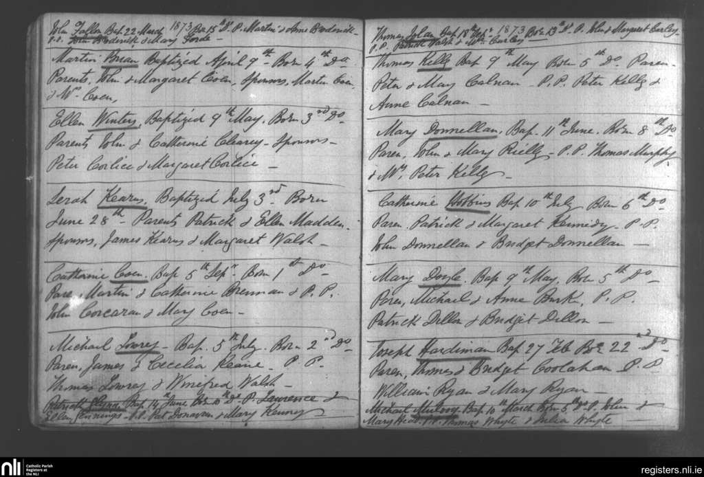 Mullagh; County of Galway; Diocese of Clonfert. Baptisms, Feb. 1873 to Sep. 1873