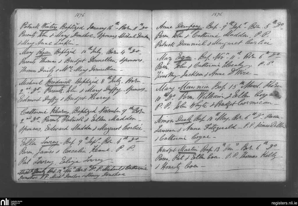 Mullagh; County of Galway; Diocese of Clonfert. Baptisms, Jan. 1876 to Nov. 1876