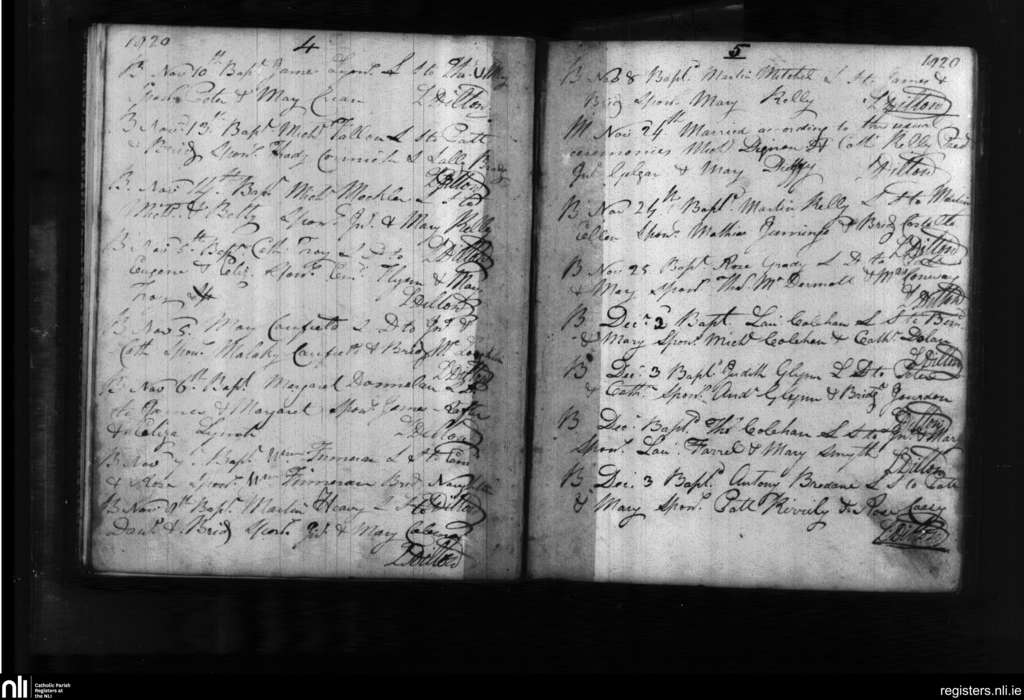 Ballinasloe; County of Roscommon, Galway; Diocese of Clonfert. Baptisms, Marriages, Nov. 1820 to Dec. 1820