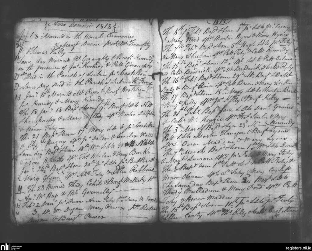 Leitrim; County of Galway; Diocese of Clonfert. Baptisms, Marriages, Deaths, Jan. 1818 to Mar. 1818