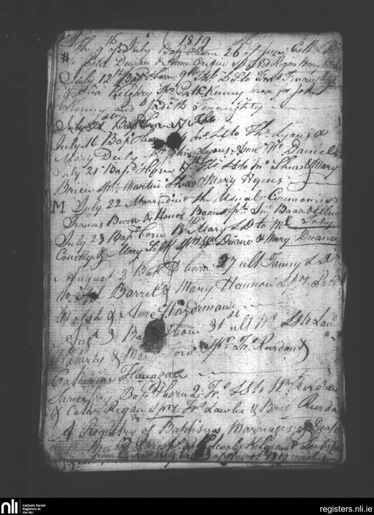 Leitrim; County of Galway; Diocese of Clonfert. Baptisms, Marriages, July 1819 to Aug. 1819