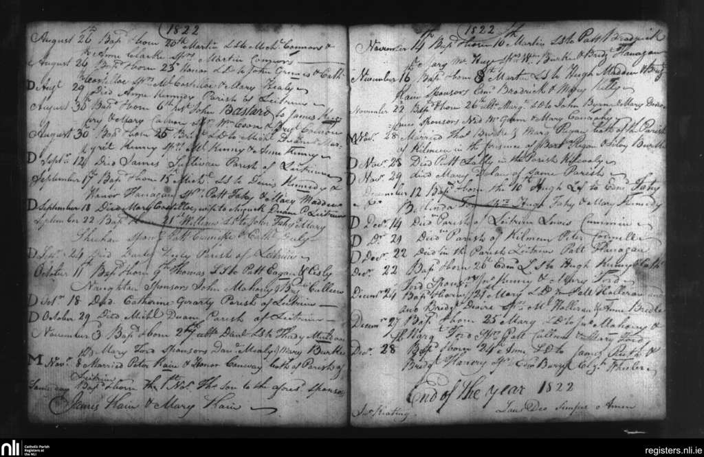 Leitrim; County of Galway; Diocese of Clonfert. Baptisms, Marriages, Deaths, Aug. 1822 to Dec. 1822