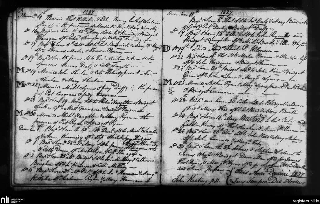 Leitrim; County of Galway; Diocese of Clonfert. Baptisms, Marriages, Deaths, Nov. 1827 to Dec. 1827