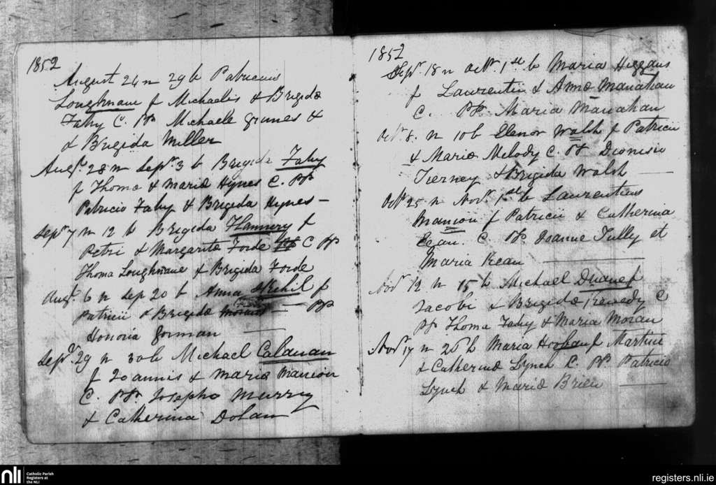 Leitrim; County of Galway; Diocese of Clonfert. Baptisms, Aug. 1852 to Nov. 1852