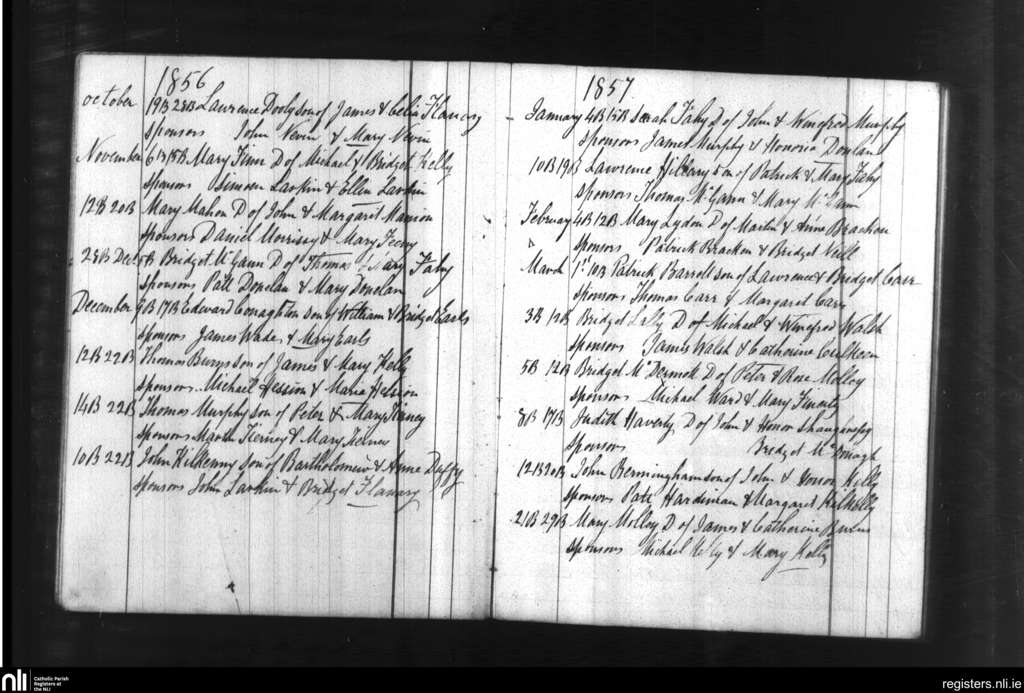 Ballymacward and Clonkeenkerrill; County of Galway; Diocese of Clonfert. Baptisms, Oct. 1856 to Mar. 1857