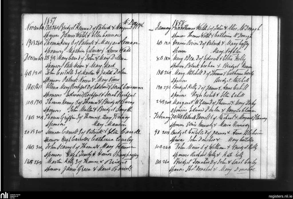 Ballymacward and Clonkeenkerrill; County of Galway; Diocese of Clonfert. Baptisms, Nov. 1857 to Feb. 1858