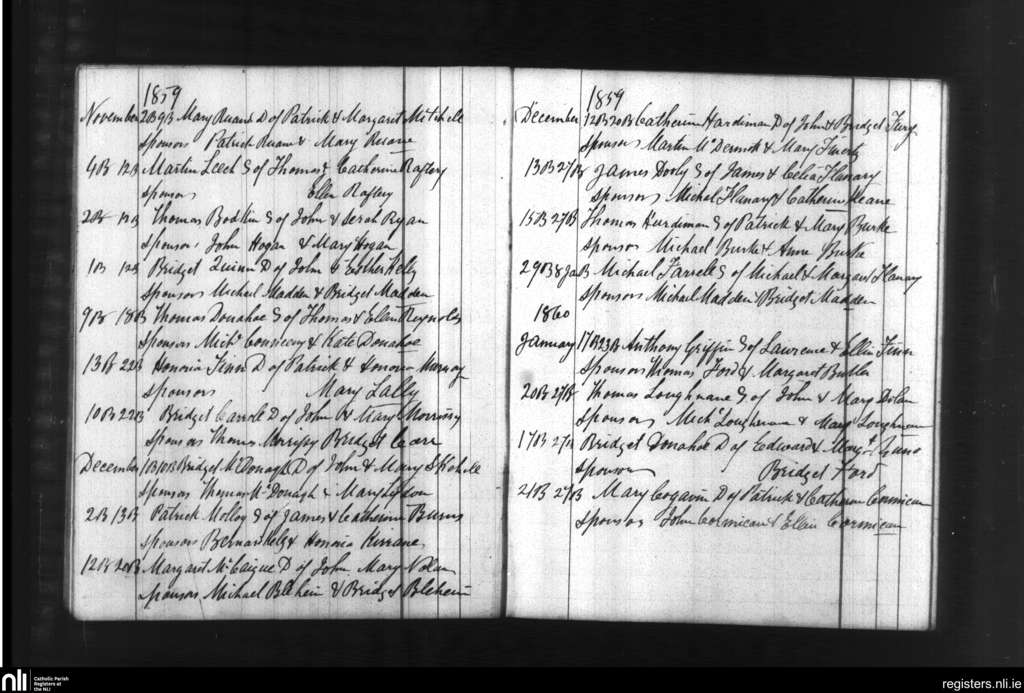 Ballymacward and Clonkeenkerrill; County of Galway; Diocese of Clonfert. Baptisms, Nov. 1859 to Jan. 1860