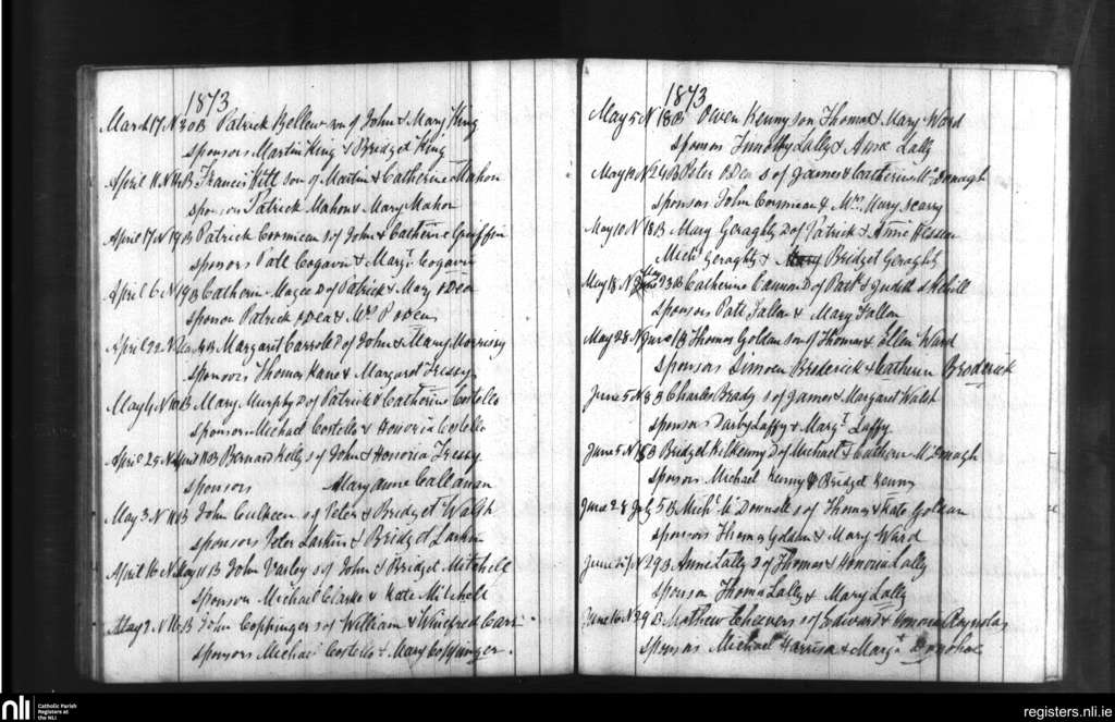 Ballymacward and Clonkeenkerrill; County of Galway; Diocese of Clonfert. Baptisms, Mar. 1873 to June 1873