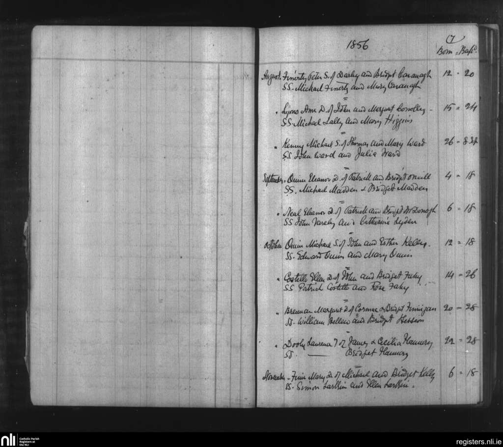Ballymacward and Clonkeenkerrill; County of Galway; Diocese of Clonfert. Baptisms, Aug. 1856 to Nov. 1856