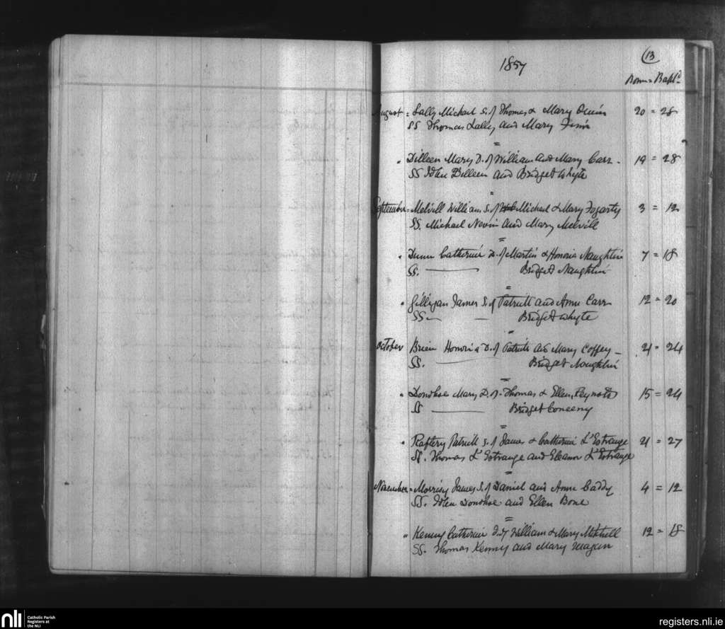 Ballymacward and Clonkeenkerrill; County of Galway; Diocese of Clonfert. Baptisms, Aug. 1857 to Nov. 1857