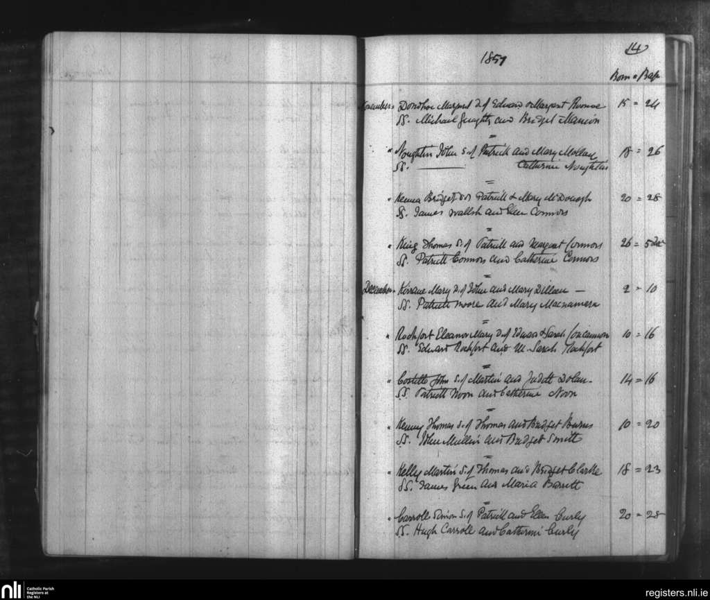Ballymacward and Clonkeenkerrill; County of Galway; Diocese of Clonfert. Baptisms, Nov. 1857 to Dec. 1857