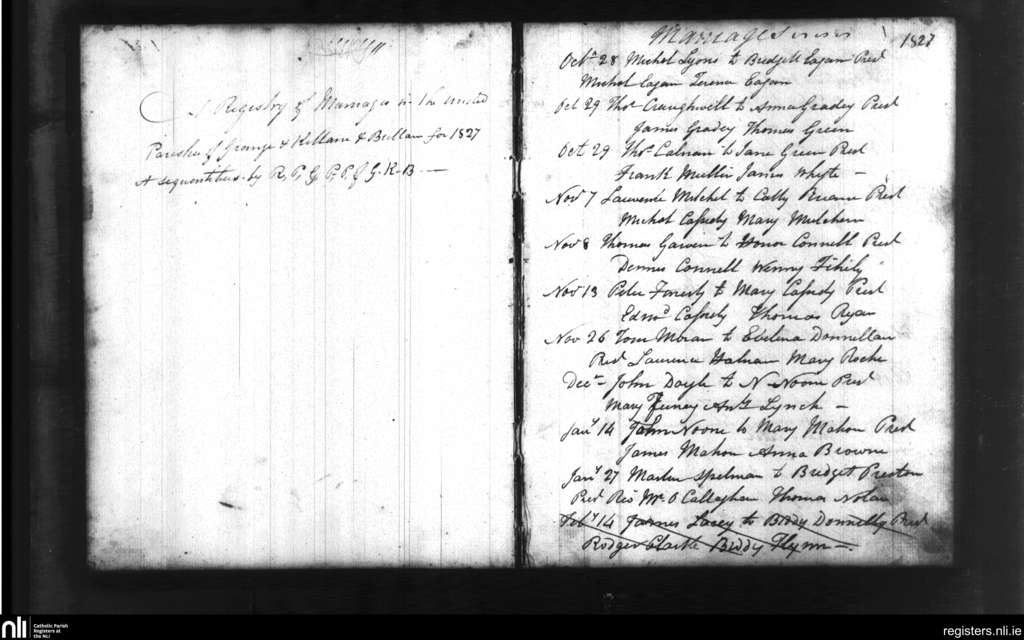 New Inn; County of Galway; Diocese of Clonfert. Marriages, Oct. 1827 to Jan. 1828