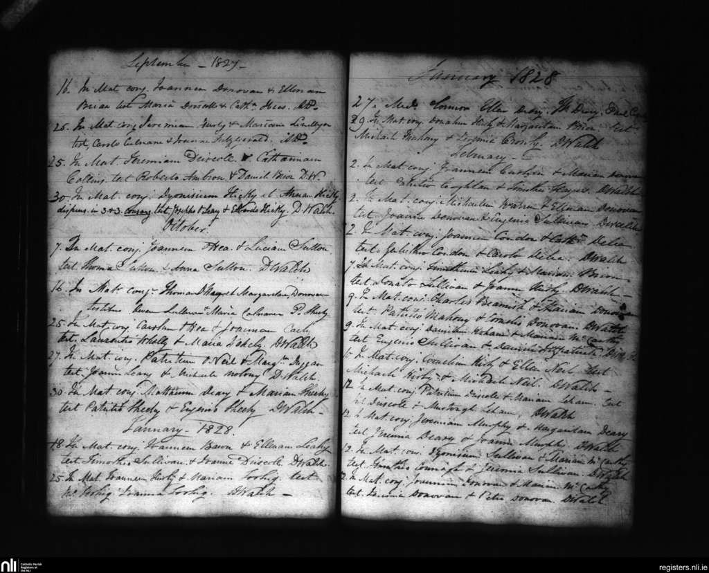Clonakilty; County of Cork; Diocese of Cork and Ross. Marriages, Sep. 1827 to Feb. 1828