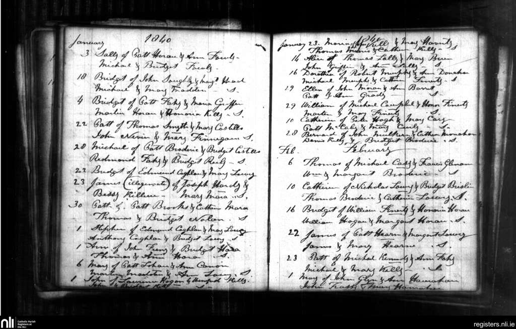 Killimore and Tiranascragh; County of Galway; Diocese of Clonfert. Baptisms, Jan. 1840 to Feb. 1840