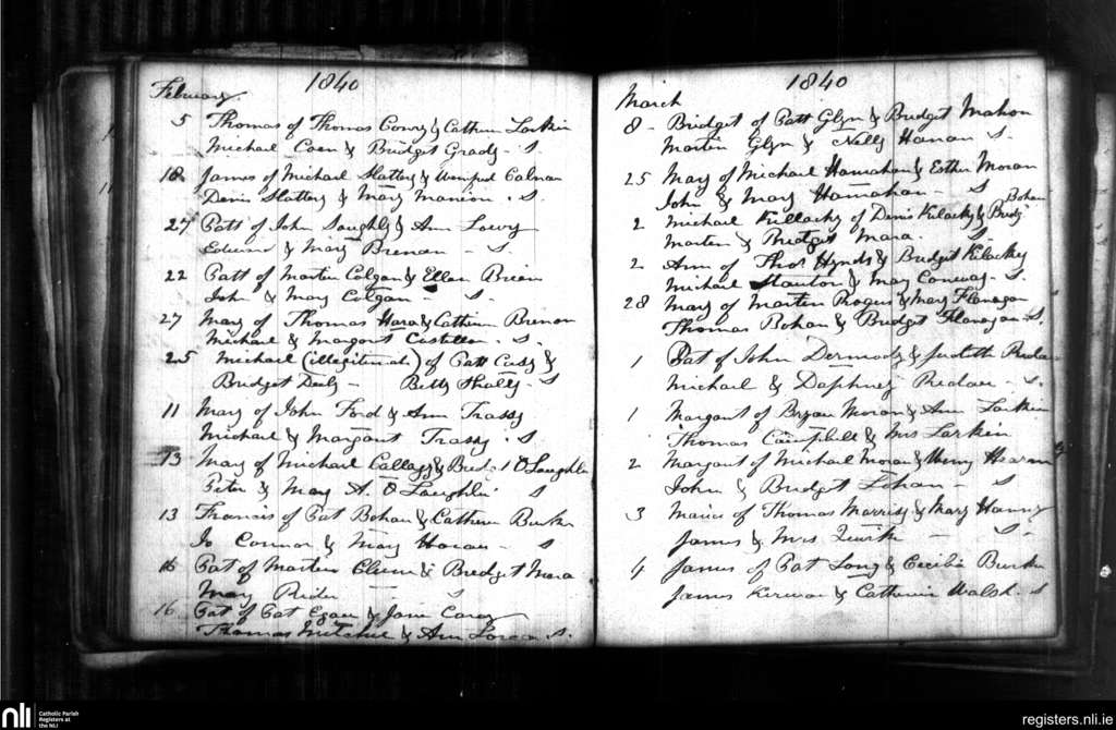 Killimore and Tiranascragh; County of Galway; Diocese of Clonfert. Baptisms, Feb. 1840 to Mar. 1840