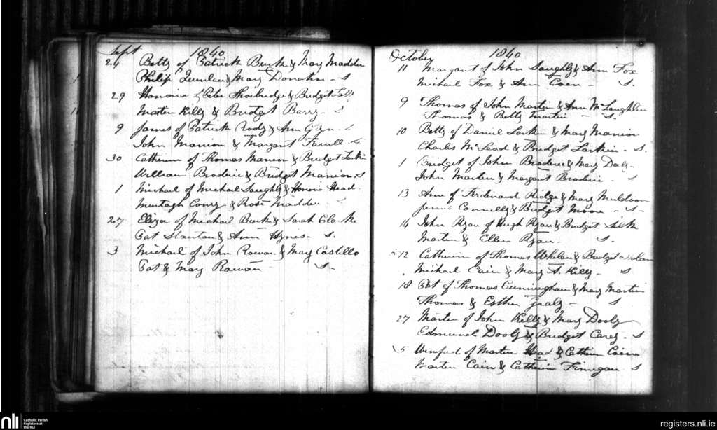 Killimore and Tiranascragh; County of Galway; Diocese of Clonfert. Baptisms, Sep. 1840 to Oct. 1840