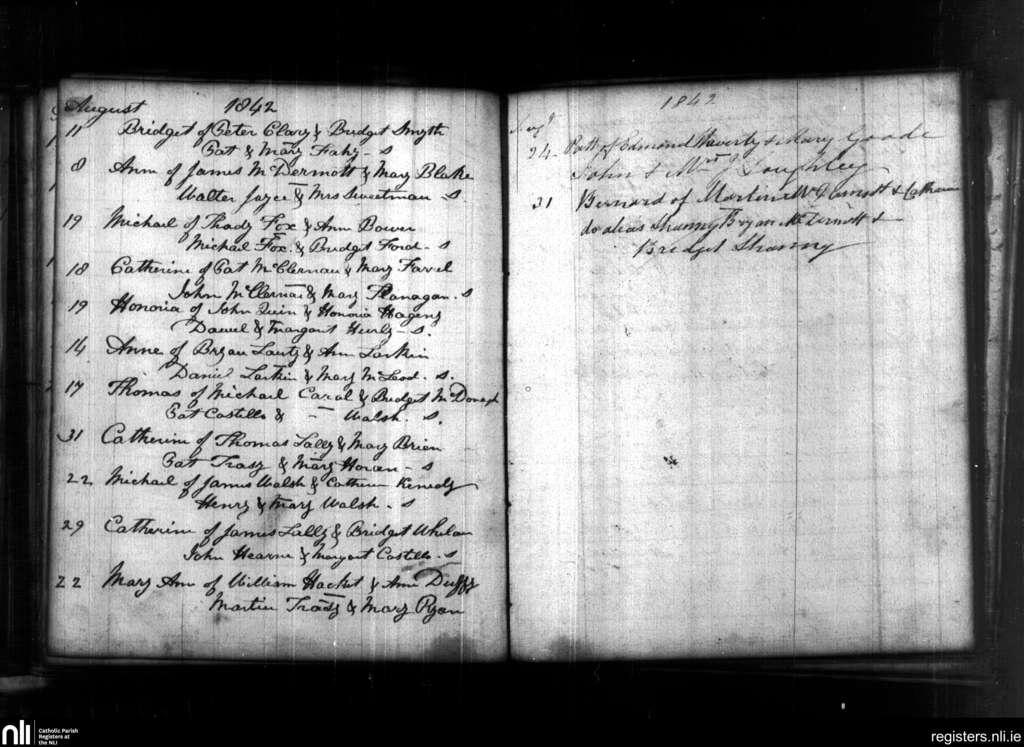 Killimore and Tiranascragh; County of Galway; Diocese of Clonfert. Baptisms, Aug. 1842
