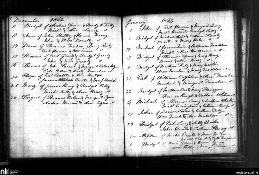 Killimore and Tiranascragh; County of Galway; Diocese of Clonfert. Baptisms, Dec. 1842 to Jan. 1843