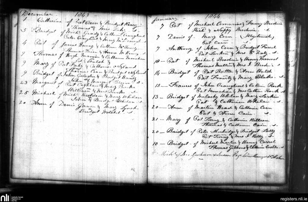 Killimore and Tiranascragh; County of Galway; Diocese of Clonfert. Baptisms, Dec. 1843 to Jan. 1844