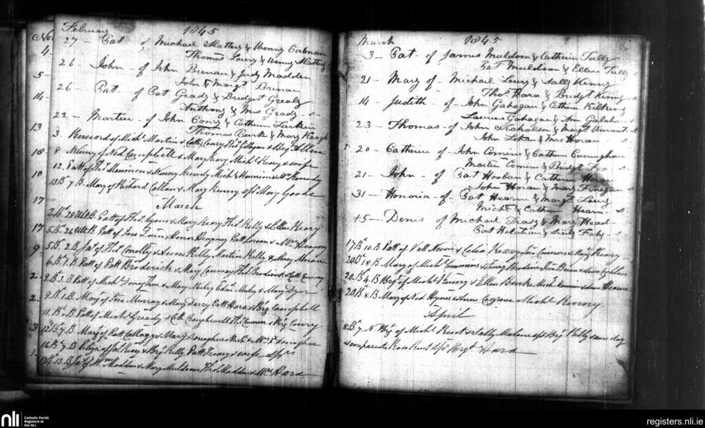 Killimore and Tiranascragh; County of Galway; Diocese of Clonfert. Baptisms, Feb. 1845 to Apr. 1845