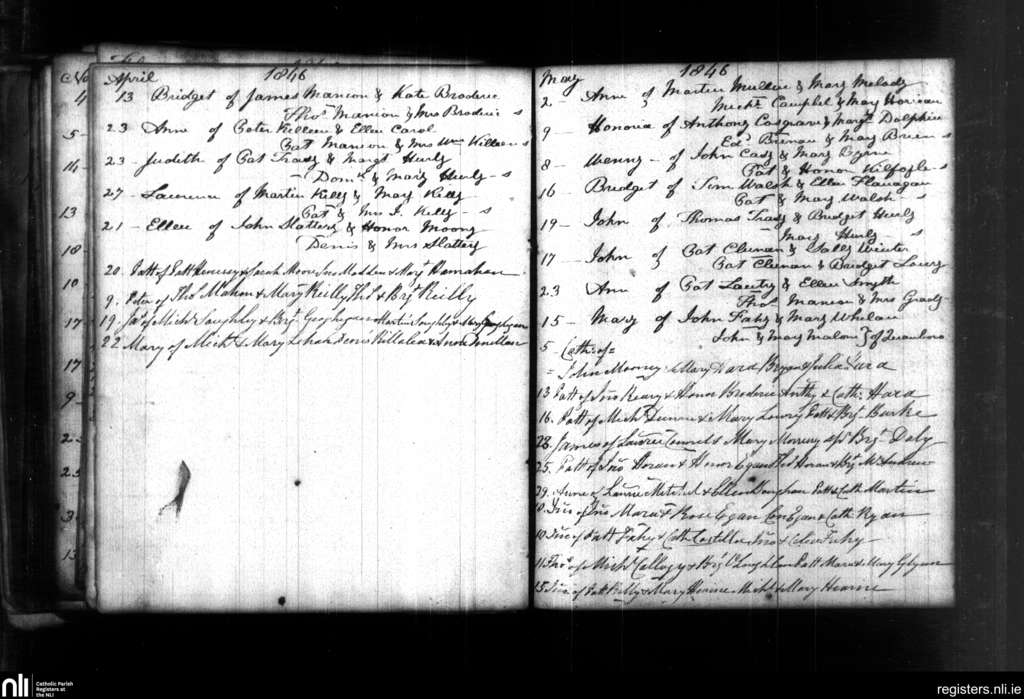 Killimore and Tiranascragh; County of Galway; Diocese of Clonfert. Baptisms, Apr. 1846 to May 1846