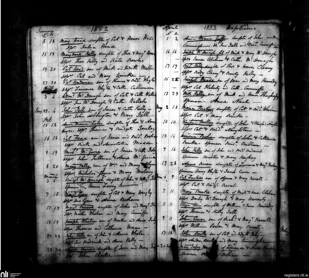Tynagh; County of Galway; Diocese of Clonfert. Baptisms, Jan. 1852 to June 1852