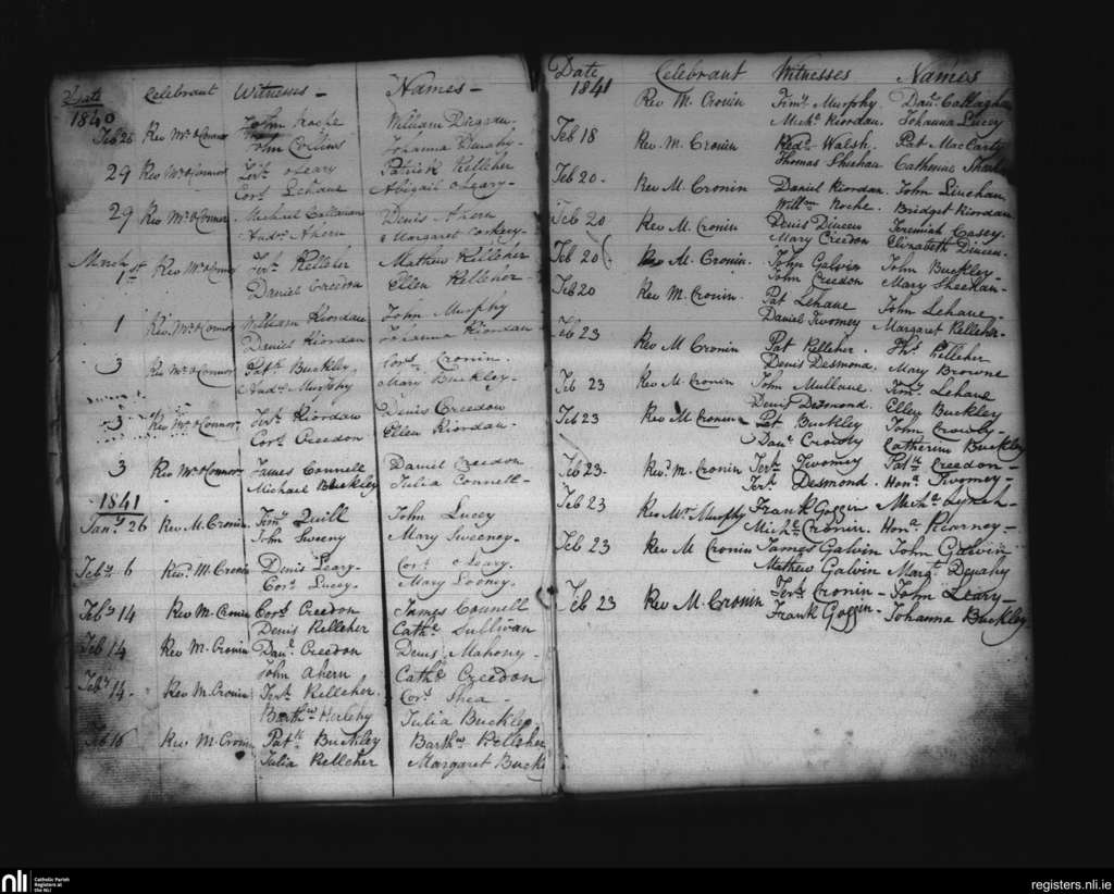 Clondrohid; County of Cork; Diocese of Cloyne. Marriages, Feb. 1840 to Feb. 1841