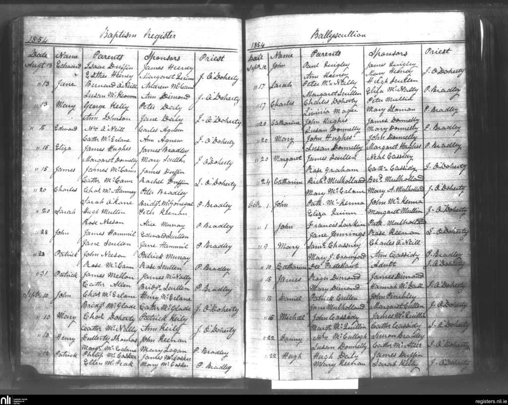 Ballyscullion; County of Derry; Diocese of Derry. Baptisms, Aug. 1854 to Oct. 1854