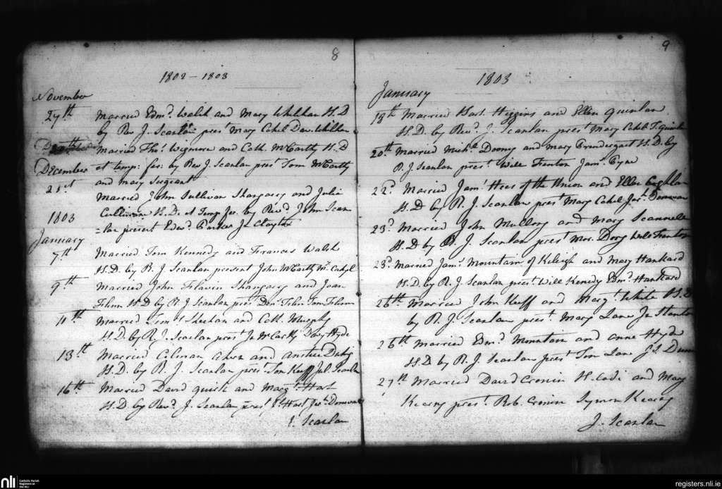 Cloyne; County of Cork; Diocese of Cloyne. Marriages, Nov. 1802 to Jan. 1803