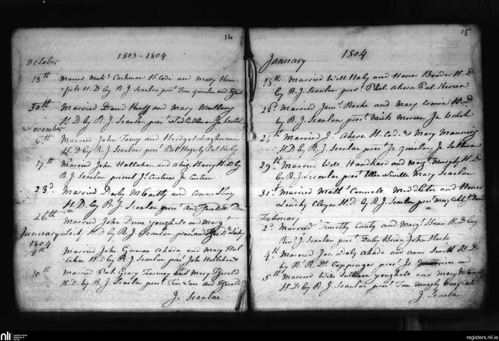 Cloyne; County of Cork; Diocese of Cloyne. Marriages, Oct. 1803 to Feb. 1804