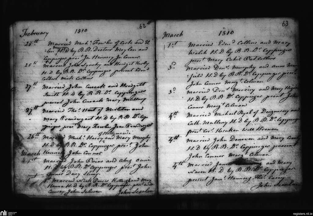 Cloyne; County of Cork; Diocese of Cloyne. Marriages, Feb. 1810 to Mar. 1810